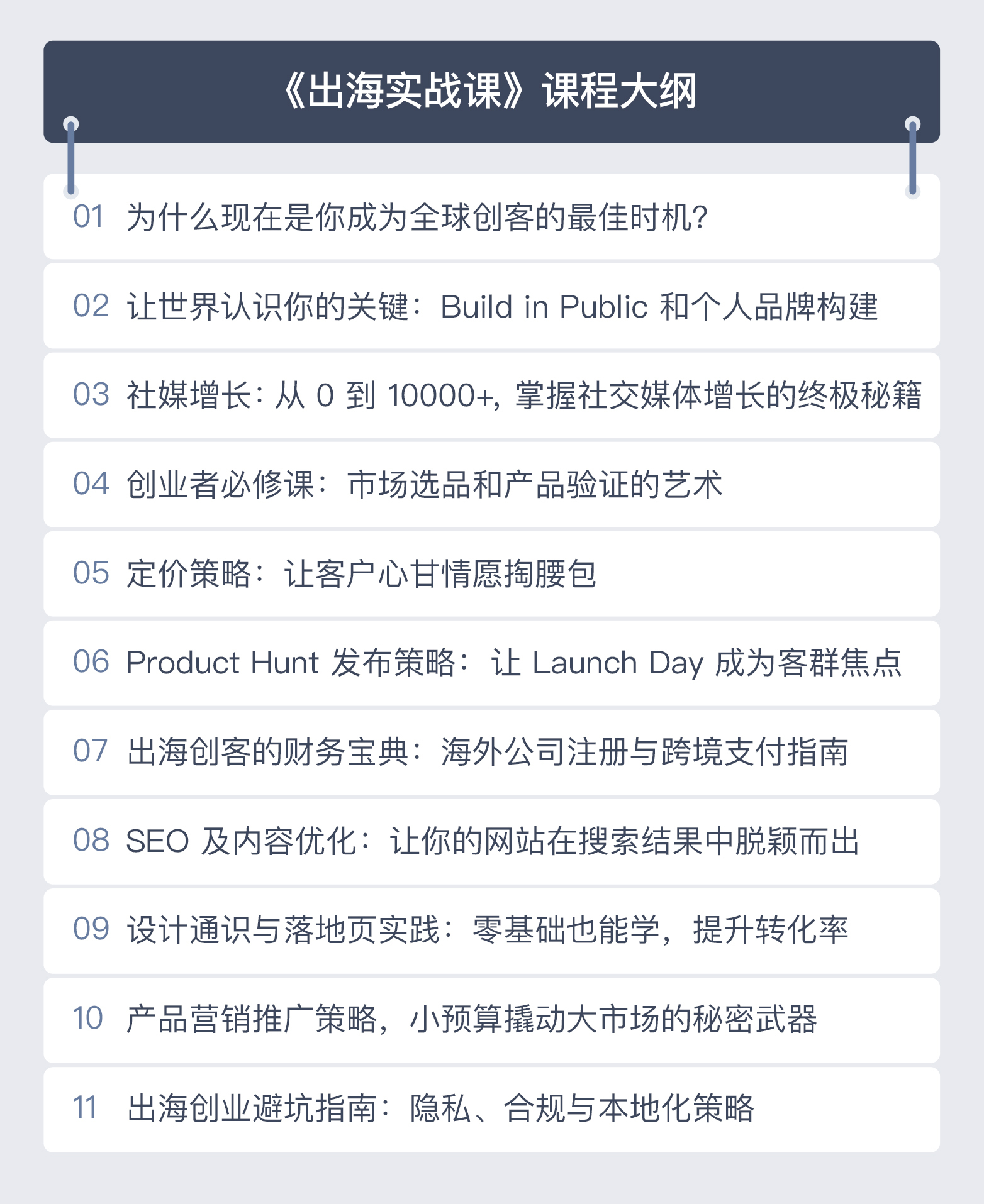 出海去孵化器结合多年的实战经验和专业建议,整合了一套独立开发出海实战课,帮助你从零起步轻松实现产品出海。无论是社交媒体增长、个人品牌打造,还是产品市场验证,从理论到实操,全方位赋能你的出海之路。